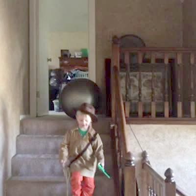 A tot boy dressed as Indiana Jones runs down a flight of stairs as a fitness ball rolls down after him.