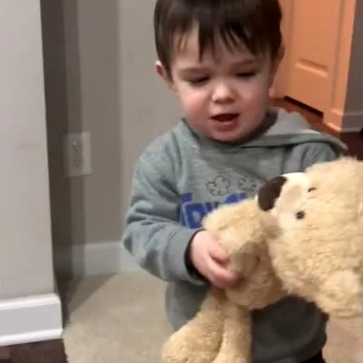 A tot boy finds a stuffed bear and then he says that he doesn't like it and throws it down on the floor.