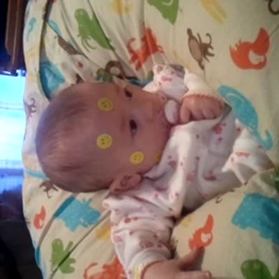 A young boy puts smiley face stickers all over his baby sister's face and hands as she sits in a baby chair in a living room.