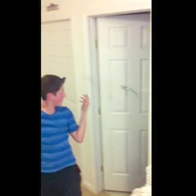 Man placed tape across doorway. At :17 a young girl walks under tape follow by a young boy who walks into it.