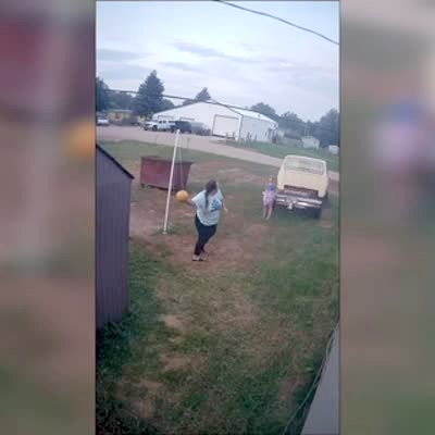 A woman plays tetherball and swings the ball around the pole. The ball flies around and hits her hard in the face. Backyard. Security footage.