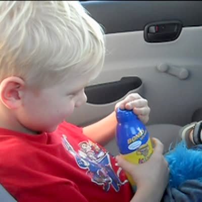 Little boy in carseat sprays himself in face with sunscreen in car (short tail).