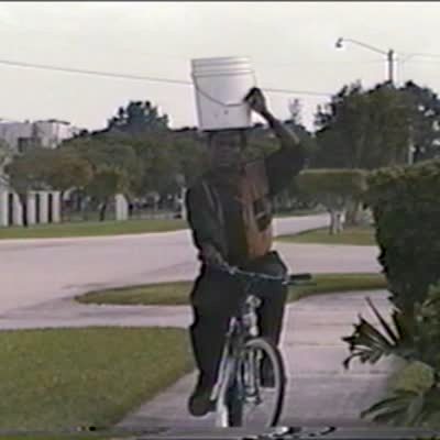 AA: Balance. Man with bucket on his head riding bike, spills bucket.