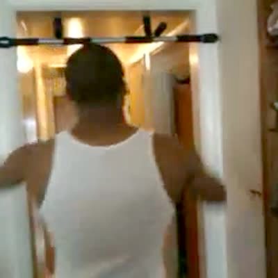 Man does pullups on bar in the doorway. The bar comes off the door and man falls to the floor.