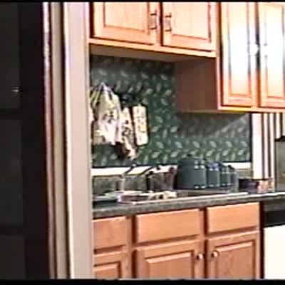 Teen boy dances for the camera in the kitchen, mom joins them. Teen boy backs up and trips over an open dishwasher and falls into it. They sing Bon Jovi song.