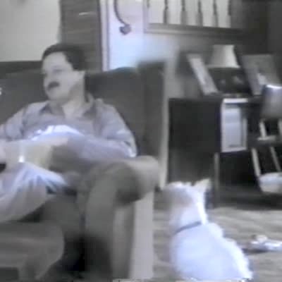 "Leave Your Message At The Bark" Man leaves dog a message on the answering machine. The dog plays it three times. He howls when he hears his owner's voice on message