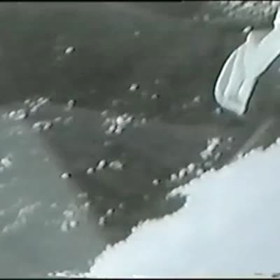 Three snowmen stand on a snow covered road. Three men sled down the road on old rail sleds, crash into and destroy all snowmen at the same time.