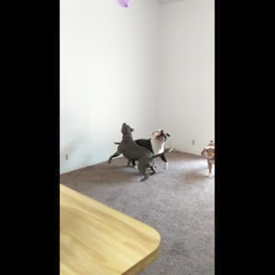 Two pitbull dogs jump in the air and repeatedly hit a balloon with their noses to bounce the balloon in the air until they both fall on the floor after they jump in the air at the same time and pop the balloon.