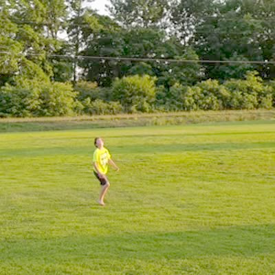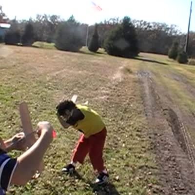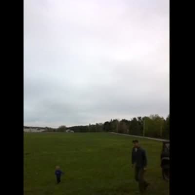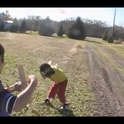 Young boy throws model airplane in field, it immediately flies back and hits him in the face.