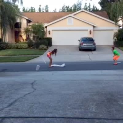 A young boy throws a model airplane on a street outdoors, it flips, and hits a young girl in the groin.