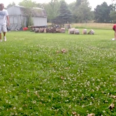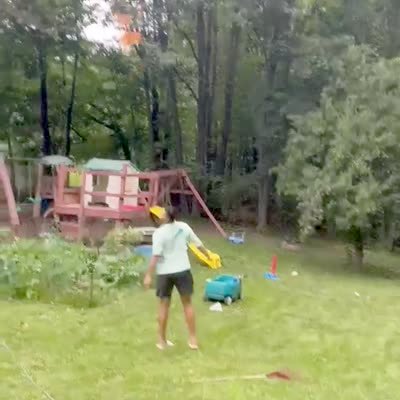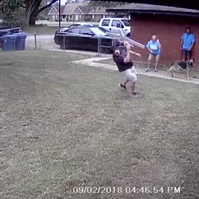A man outside tries to throw a foam airplane above his family's head but he accidentally throws it right at a woman's head. The man apologizes and hugs the woman.
