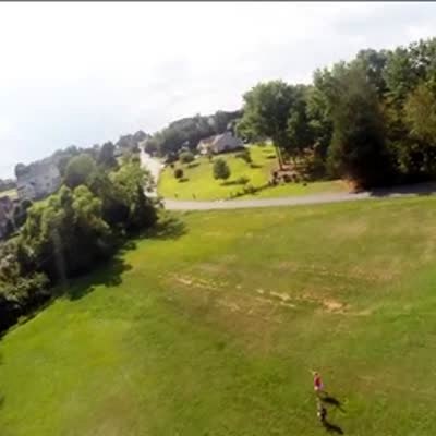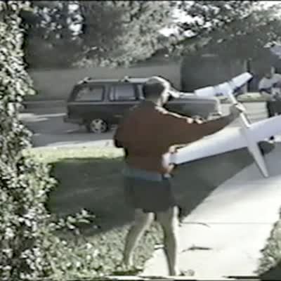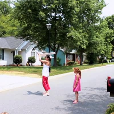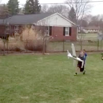 A man throws a large model airplane to his son but when the plane loops and flies back, a small girl runs to catch it and crashes into it before falling to the ground outdoors.