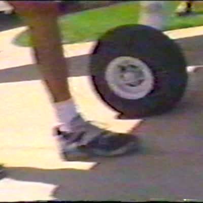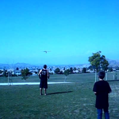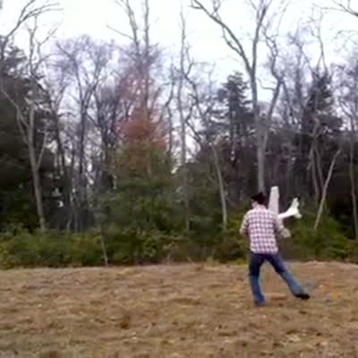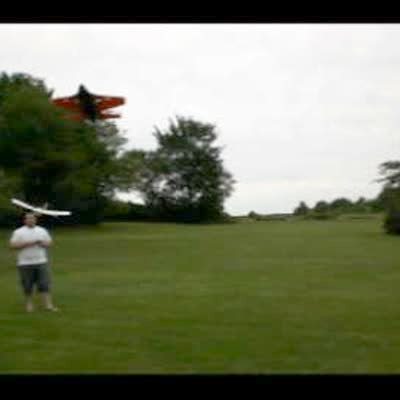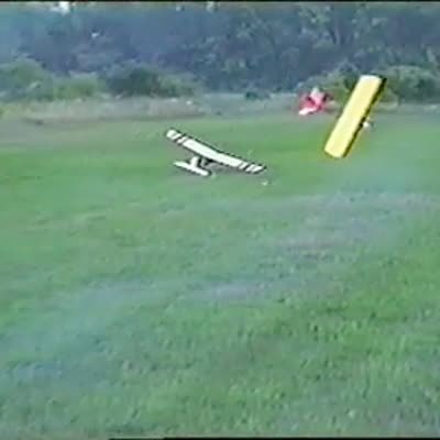 Dog chases remote control model airplane. Man goes to catch the plane before the dog gets it but he trips and falls. The glider then flies at the cameraman who yells "Goddammit" and falls over.