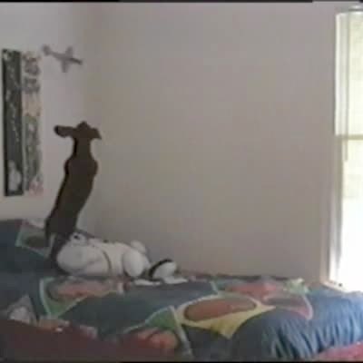 Dog (daschund) chases model airplane flying in circles over boy's bed.