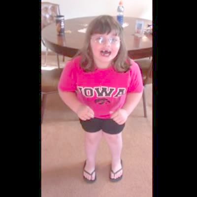 A young girl screams "I'm going to fly' and jumps around excitedly indoors. She yells "I'm going to see God!"