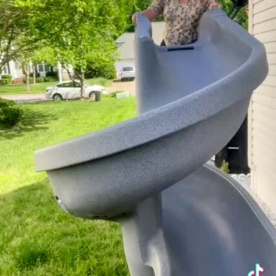 "Mother-in-Law-Breaker" A woman slides down a twisty pool slide saying she is going to be the first one to use it. Then the entire slide tips over and she falls. TikTok.