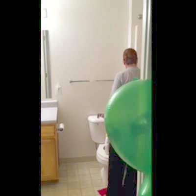 A woman screams when she sees an inflatable alien toy when she turns around while she cleans the bathroom.