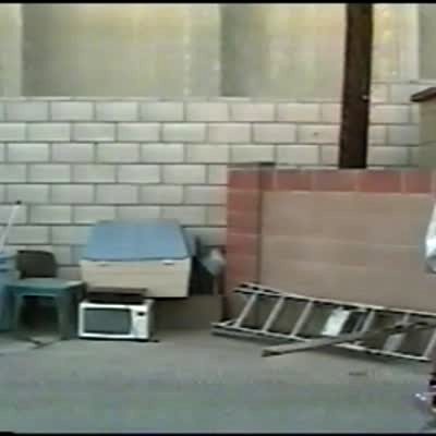 A man pulls a chimney off of a house with a rope attached to a trailer cart. The chimney falls into the trailer and breaks apart.