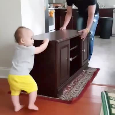 A tot boy helps a man move a cabinet in the house. Foreign language.