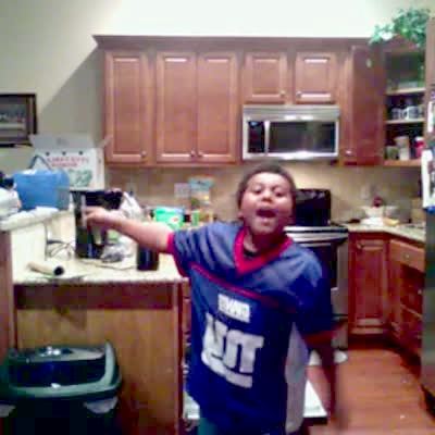Teen boy dances for the camera in the kitchen, mom joins them. Teen boy backs up and trips over an open dishwasher and falls into it. They sing Bon Jovi song.
