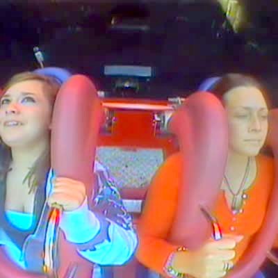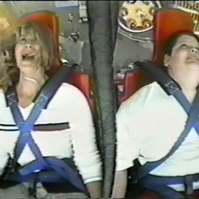 "Passed Out Passenger" Two teen girls ride slingshot ride, girl on left passes out cold (video cuts in and out. download for audio) Faint. Woman. Roller coaster.