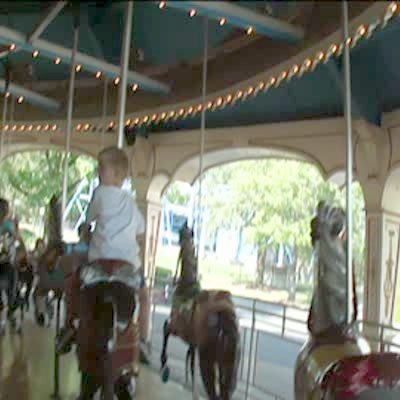 Squirrel sits on the wood frame of an amusement park carousel. The camera pans to show the rest of the ride spinning, then back to the squirrel who looks at the camera.