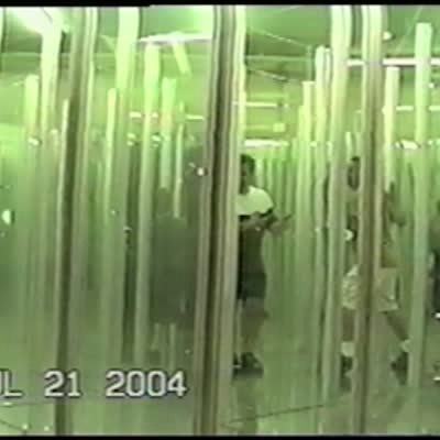 A man and two young girls go through a hall of mirrors maze. The younger girl runs fast into a mirror and falls.