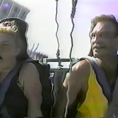 A man and a young boy ride a roller coaster together. The son says, "Aw hell naw," at the top. He then calls the dad a liar as he goes through a loop. Featured talent cleared only (the man and his son).