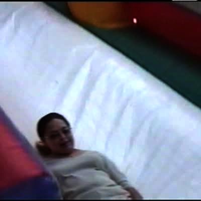Woman screams bloody murder while going down children's slide. She is scared to go down. Amusement park