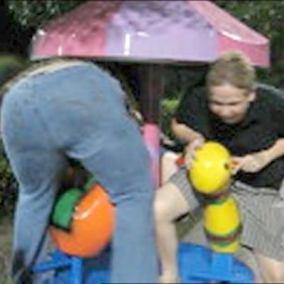 A woman rides a kids' carousel. Her butt sticks out.