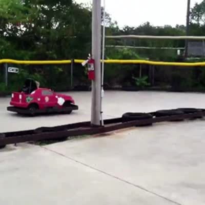 Two young boys ride in circles at a kids go kart track at an amusement park. One boy gets his kart stuck on the barricade in the middle of the track. The worker teen boy helps him get his car unstuck. Then the other boy runs over the worker teen boy, knocking him up in the air and down to the track. Action 1:30 to 2:15.