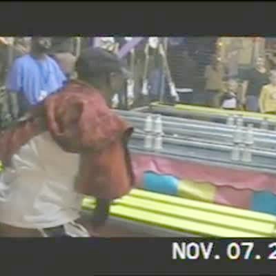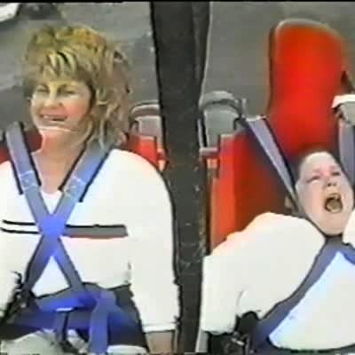 Slingshot ride -- big boy almost falls out of chair due to "g" force.