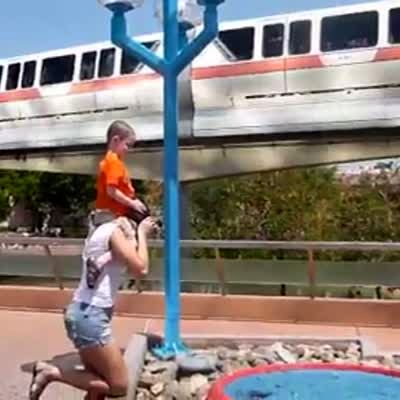 Tot boy on mom's shoulders is sprayed in the face by a fountain at Disneyworld.
