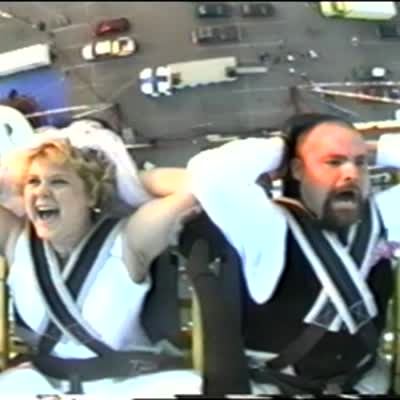 Bride and groom ride slingshot ride and groom is very scared. He makes a great face and screams.