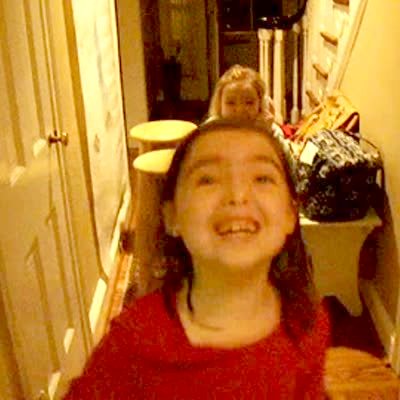 Young girl talks on a phone in a hallway. She screams and yells to her sister that they're getting on a plane tonight and going to Disney World. The two of them scream, then they dance and sing. Surprise.
