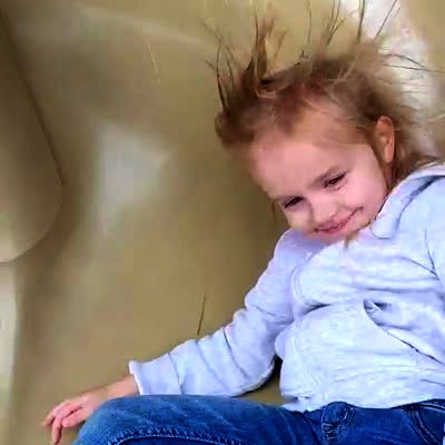 A young girl goes down a slide at a playground, then her hair stands straight up from static electricity.