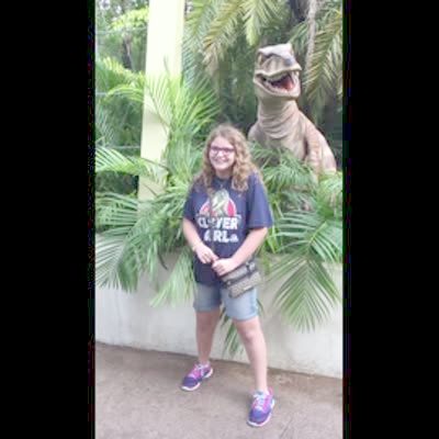 A girl poses for pictures in front of an animatronic dinosaur at a theme park. She turns around to say goodbye when the robot dinosaur roars, scaring her, causing her to fall to the ground.