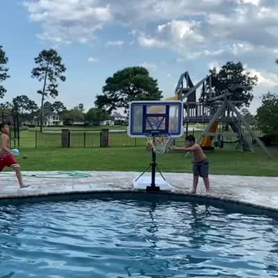 A young boy tries to dunk a basketball into a pool hoop but hits another boy in the face instead. Slow motion.