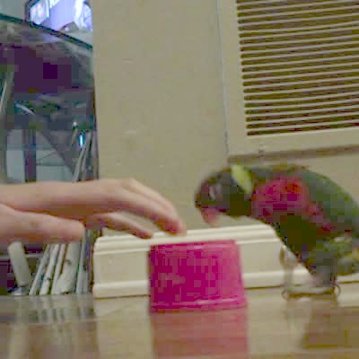 A Lorikeet bird walks back and forth to chase a cup while a woman slides it across the living room floor. Then it takes the cup from the woman and starts to play with it.