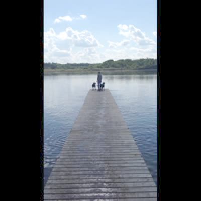 "Fido Fetch Fail" Two dogs run down a dock with a man outdoors, but stop suddenly and run back when the man throws the stick out into the water.