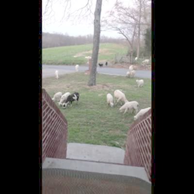 A young woman runs toward her front door pursued by a herd of goats and goes inside her home. When the goats are distracted, the woman runs out of the house again and the goats follow her once more. She finally loses them and they wander off. Security footage.