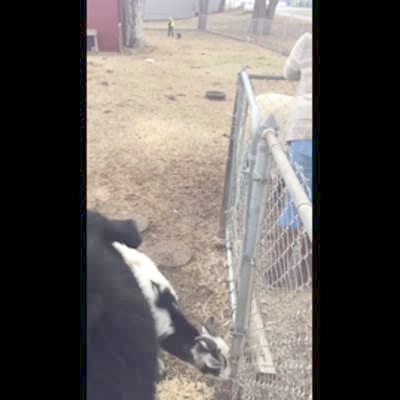 "Headbutting Buddies" Teen boy wearing a football helmet lowers his head at a ram and lets the ram head butt him. Ram then chases teen around an outdoor pen. Goat.