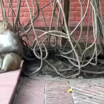 A wild monkey runs at a man and chases him as he runs away through a park and screams and laughs.