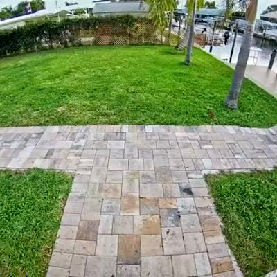 A dog runs through the yard and jumps through the window screen on the back patio. Security footage.