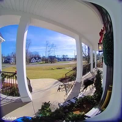 A potbelly pig walks onto the front porch of a house, then a tot girl and a tot boy walk out the front door and scream and run away. Security footage.