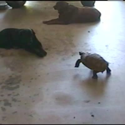 Turtle attacks black lab dog. Dog tries to bite turtle back but he can't. Rivalry. Pets.