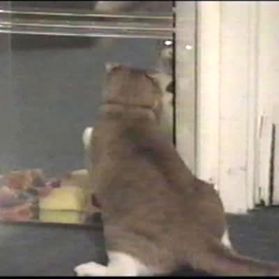 Small terrier dog waits outside doggy door until a cat jumps through the opening & tries to attack the dog.