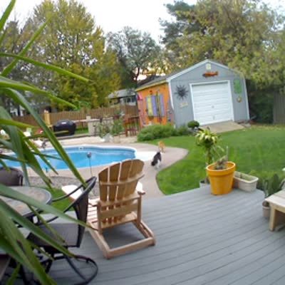 A black cat runs up behind a tan cat and pushes him into a swimming pool.