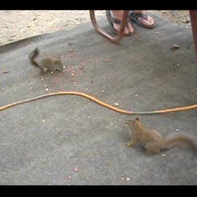 Chipmunk attacks dog. Jumps at him while dog is sniffing him.