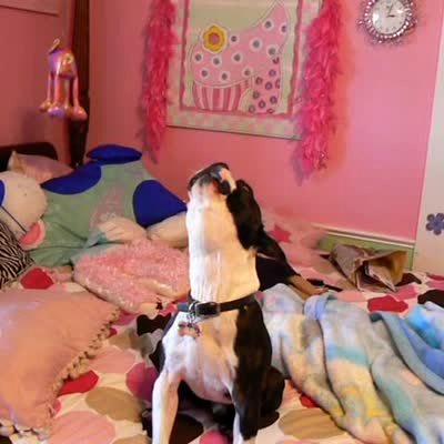 Bulldog turns his head from side to side and howls when girl makes noises. Dog sits on polka dot sheets on bed.